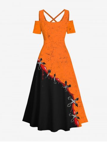 Halloween Dresses > Plus Size Halloween Costume Pumpkin Face Colorblock Ripped Lace Up 3D Print Cold Shoulder Crisscross Maxi Dress