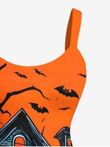 Plus Size Halloween Costume Pumpkin Ghost Bat Castle Print Tank Dress - Orange - S