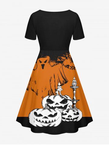 Plus Size Halloween Costume Pumpkin Ghost Candles Bat Colorblock Print Cinched Dress - Multi-a - 1x