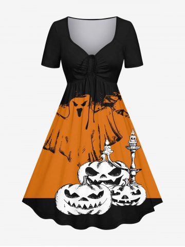 Plus Size Halloween Costume Pumpkin Ghost Candles Bat Colorblock Print Cinched Dress - Multi-a - 2x