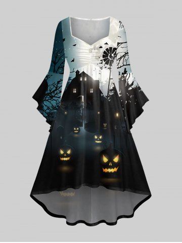 Halloween Dresses > Plus Size Halloween Costume Pumpkin House Tree Bird Windmill Print Ruched Flare Sleeve High Low Dress
