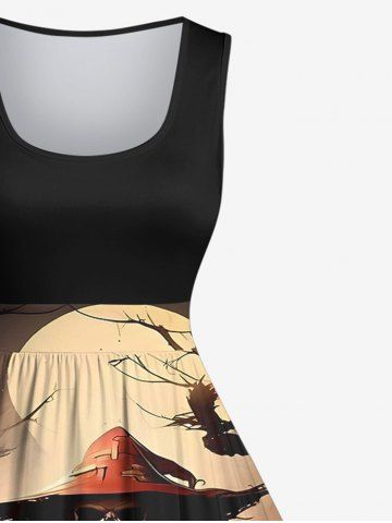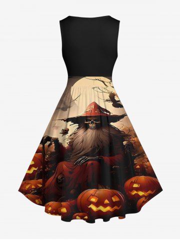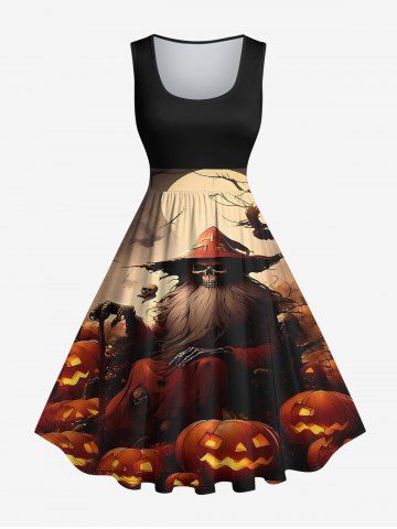 Plus Size Halloween Costume Pumpkin Latern Moon Skull Scarecrow Print 1950s Vintage Dress - Black - L