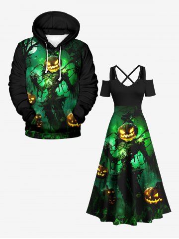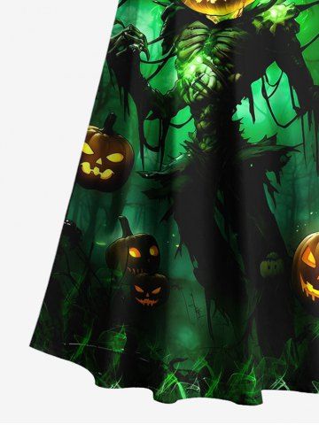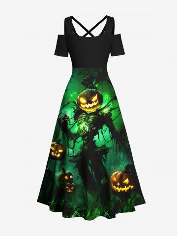 Halloween Dresses > Plus Size Halloween Costume Pumpkin Latern Skeleton Wizard Print Cold Shoulder Crisscross Dress