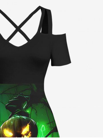 Halloween Dresses > Plus Size Halloween Costume Pumpkin Latern Skeleton Wizard Print Cold Shoulder Crisscross Dress
