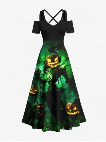 Halloween Dresses > Plus Size Halloween Costume Pumpkin Latern Skeleton Wizard Print Cold Shoulder Crisscross Dress