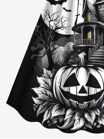Plus Size Halloween Costume Pumpkin Leaf Tree Bat Moon Castle Print Cinched Dress - Black - M