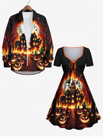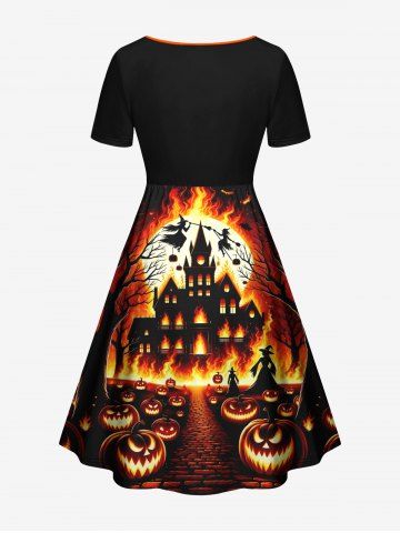 Plus Size Halloween Costume Pumpkin Moon Fire Flame Tree Print Cinched Dress - Multi-a - 1x