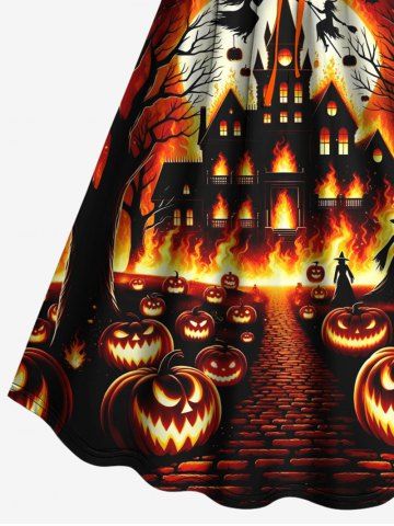 Halloween Dresses > Plus Size Halloween Costume Pumpkin Moon Fire Flame Tree Print Cinched Dress