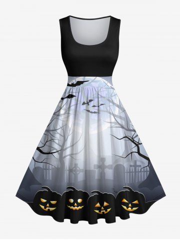 Plus Size Halloween Costume Pumpkin Moon Tree Cross Tomb Print 1950s Vintage Dress - Black - 1x