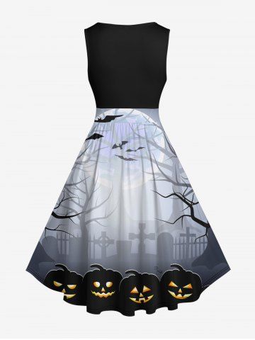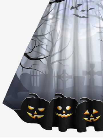 Plus Size Halloween Costume Pumpkin Moon Tree Cross Tomb Print 1950s Vintage Dress - Black - 3x