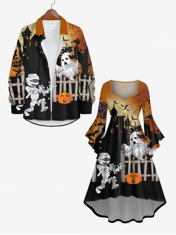 Halloween Dresses > Plus Size Halloween Costume Pumpkin Mummy Ghost Bat Print Flare Sleeve High Low Dress