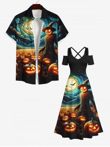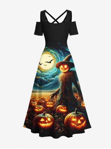 Halloween Dresses > Plus Size Halloween Costume Pumpkin Scarecrow Bat Moon Colorful Print Cold Shoulder Crisscross Maxi Dress