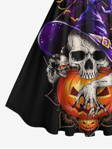 Plus Size Halloween Costume Pumpkin Skull Bat Hat Print 1950s Vintage Dress - Black - 1x