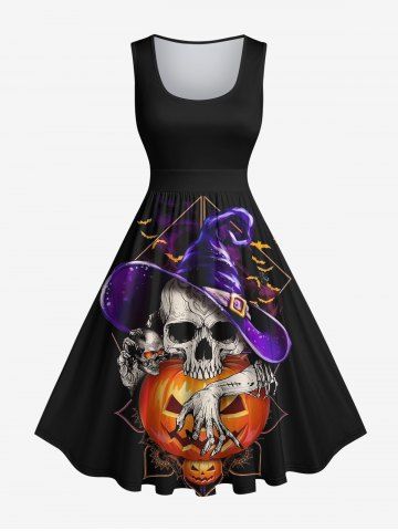 Plus Size Halloween Costume Pumpkin Skull Bat Hat Print 1950s Vintage Dress - Black - 2x