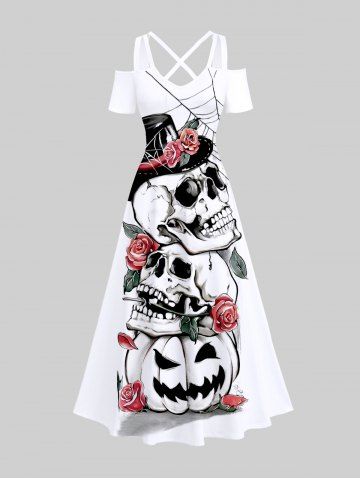Plus Size Halloween Costume Pumpkin Skulls Rose Flower Spider Web Print Cold Shoulder Crisscross Maxi Dress - White - 5x