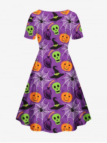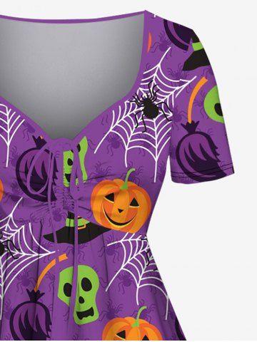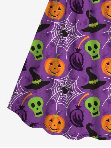 Plus Size Halloween Costume Pumpkin Spider Web Skull Hat Print Cinched Dress - Purple - 4x