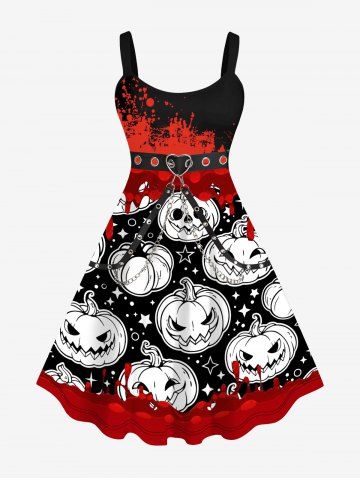 Plus Size Halloween Costume Pumpkin Star Grommets PU Leather Stripes Print Tank Dress - Red - 2x