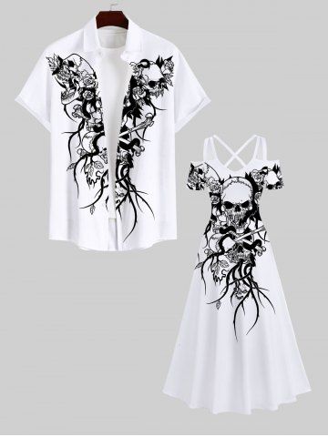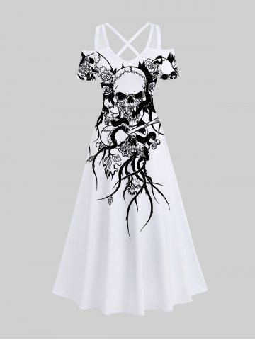 Plus Size Halloween Costume Skull Flowers Leaf Print Cold Shoulder Crisscross Maxi Dress - White - 5x