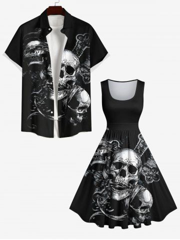 Plus Size Halloween Costume Skulls Cross Print 1950s Vintage Dress - Black - S