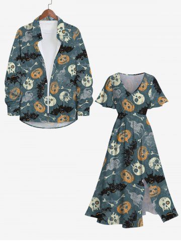 Halloween Dresses > Plus Size Halloween Costume Skulls Ghost Bat Pumpkin Print Split Midi Dress