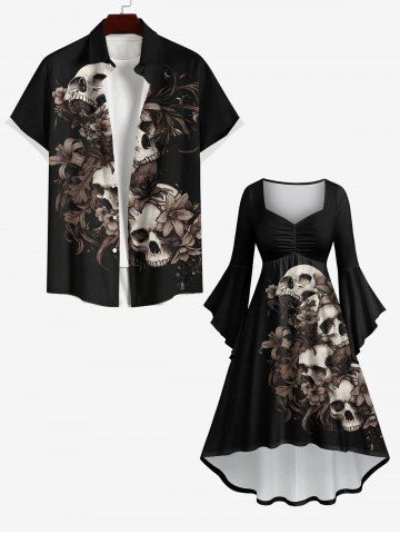 Plus Size Halloween Costume Skulls Leaf Flower Print Ruched Flare Sleeve High Low Dress - Black - M