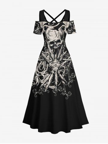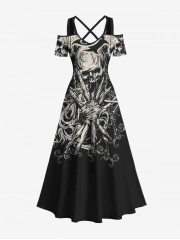 Halloween Dresses > Plus Size Halloween Costume Skulls Print Cold Shoulder Crisscross Maxi Dress