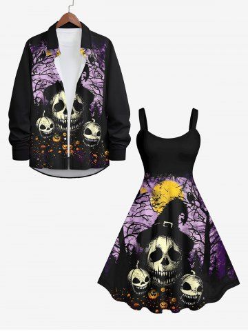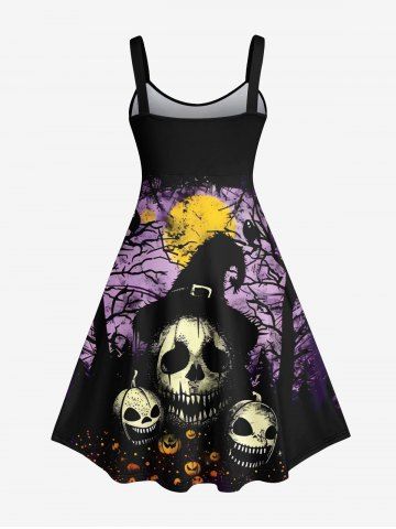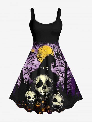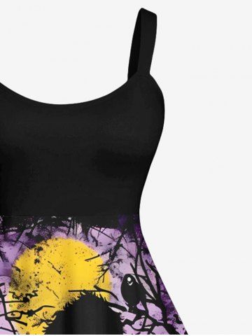 Plus Size Halloween Costume Skulls Pumpkin Moon Tree Bird Print Tank Dress - Black - 4x