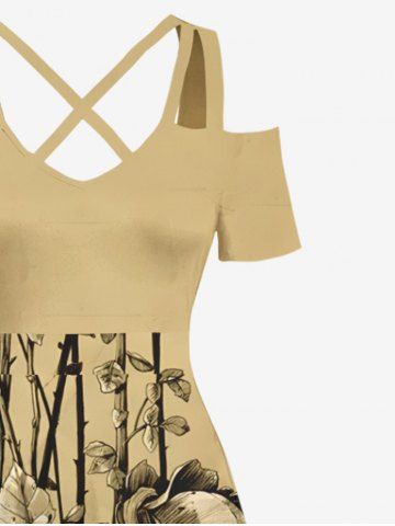 Plus Size Halloween Costume Skulls Rose Flower Leaf Print Cold Shoulder Crisscross Maxi Dress - Light Coffee - S