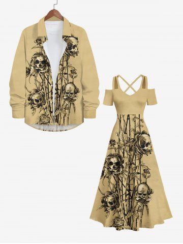 Plus Size Halloween Costume Skulls Rose Flower Leaf Print Cold Shoulder Crisscross Maxi Dress - Light Coffee - 2x