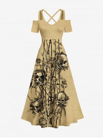 Plus Size Halloween Costume Skulls Rose Flower Leaf Print Cold Shoulder Crisscross Maxi Dress - Light Coffee - 3x