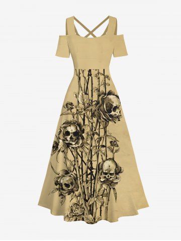 Plus Size Halloween Costume Skulls Rose Flower Leaf Print Cold Shoulder Crisscross Maxi Dress - Light Coffee - 4x