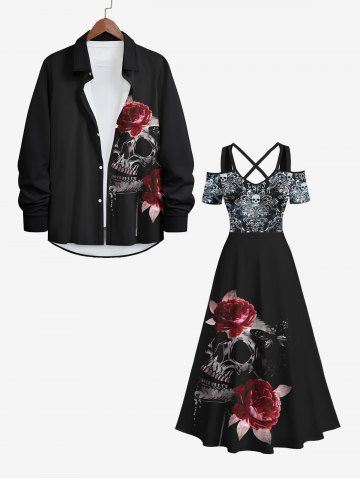 Halloween Dresses > Plus Size Halloween Costume Skulls Rose Flower Print Cold Shoulder Crisscross Maxi Dress