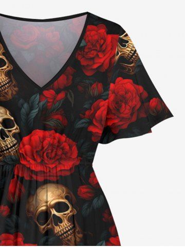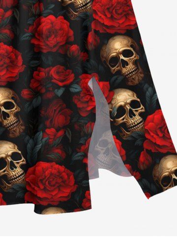 Halloween Dresses > Plus Size Halloween Costume Skulls Rose Flower Print Split Midi Dress