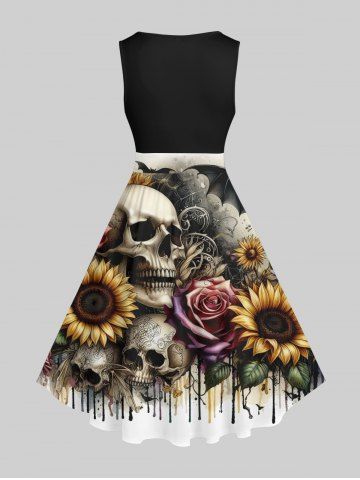 Halloween Dresses > Plus Size Halloween Costume Skulls Rose Sunflower Bat Print 1950s Vintage Dress