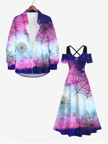 Halloween Dresses > Plus Size Halloween Costume Spider Web Bat Pumpkin Ombre Colorblock Print Cold Shoulder Crisscross Maxi Dress