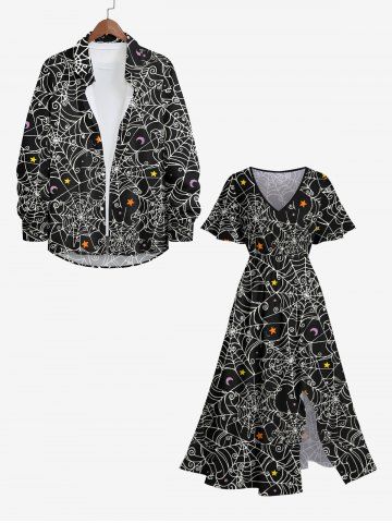Plus Size Halloween Costume Spider Web Moon Star Print Split Midi Dress - Black - L