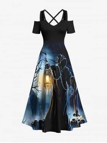 Plus Size Halloween Costume Tree Wizard Tomb Lantern Print Cold Shoulder Crisscross Maxi Dress - Black - 5x