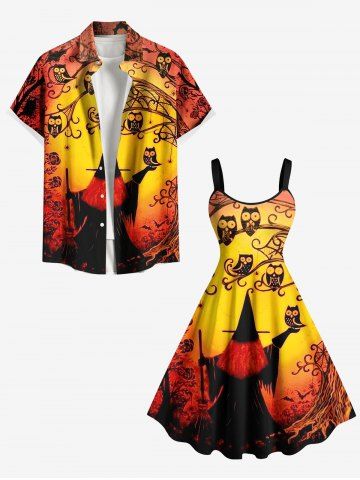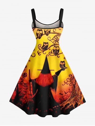 Plus Size Halloween Hat Wizard Owl Bat Spider Web Print Tank Dress - Yellow - 4x