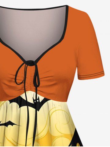 Plus Size Halloween Moon Pumpkin Bat Print Cinched Dress - Orange - L