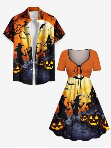 Plus Size Halloween Moon Pumpkin Bat Print Cinched Dress - Orange - 1x