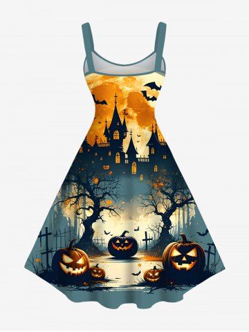 Plus Size Halloween Moon Pumpkin Bat Trees Cross Castle Print Tank Dress - Green - 4x