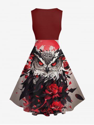 Plus Size Halloween Owl Rose Flowers Print 1950s Vintage Dress - Red - M