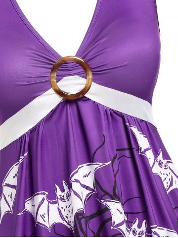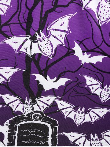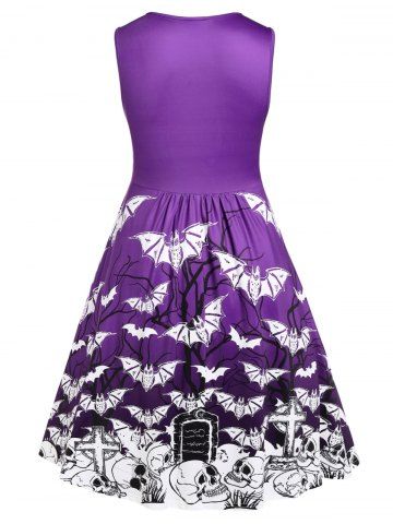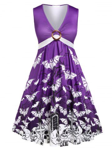 Plus Size Halloween Plunge Bat Skull Print Gothic Dress - Purple - 5x
