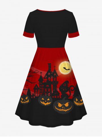 Plus Size Halloween Pumpkin Bat Moon Cat Print Cinched Dress - Deep Red - 3x