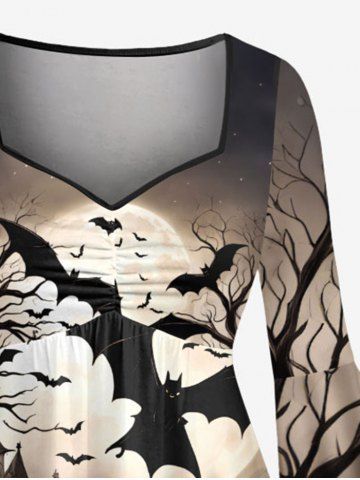 Plus Size Halloween Pumpkin Bat Tree Castle Print Ruched High Low Flare Sleeves Dress - Light Brown - Xxs