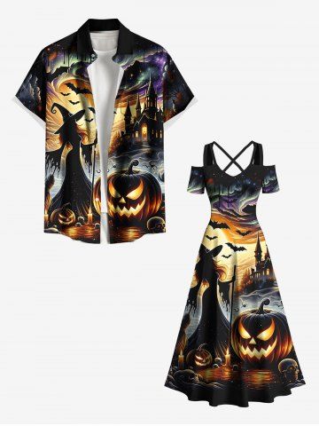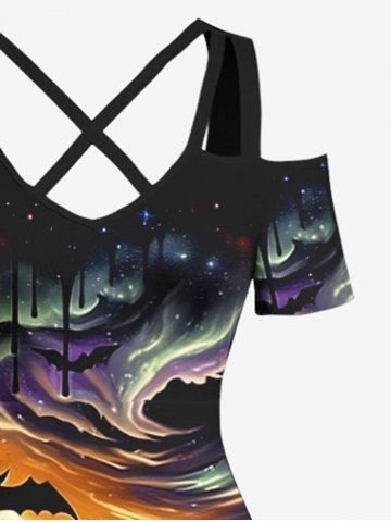 Plus Size Halloween Pumpkin Bat Wizard Skulls Candles Print Cold Shoulder Crisscross Maxi Dress - Black - Xxs