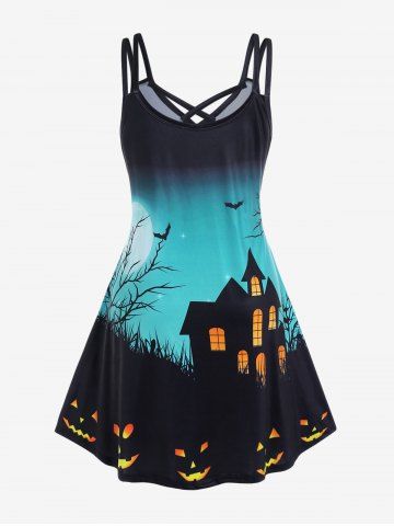 Plus Size Halloween Pumpkin Bats Printed Crisscross A Line Sleeveless Dress - Black - L | Us 12