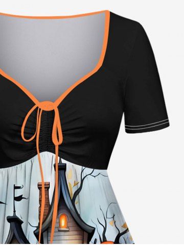 Plus Size Halloween Pumpkin Castle Bat Print Cinched Dress - Black - 3x