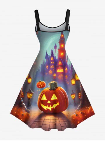 Plus Size Halloween Pumpkin Castle Street Light Print Tank Dress - Orange - L