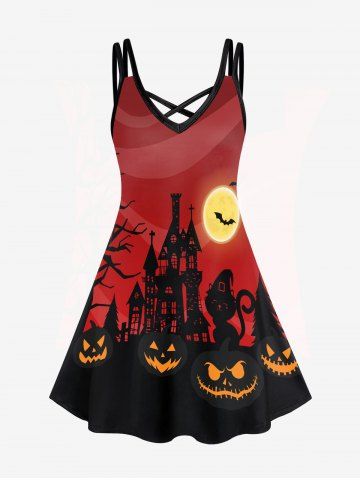 Plus Size Halloween Pumpkin Cat Bat Printed Crisscross A Line Sleeveless Dress - Deep Red - 2x | Us 18-20